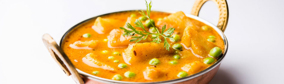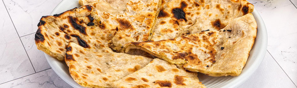 Warm gekruide aardappelcurry met krokant Indiaas gebakken brood.