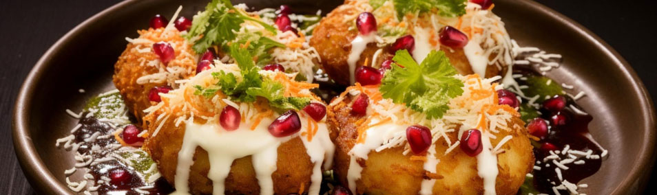 Knapperig, uitgehold deeg met yoghurt, gekruide Indiase aardappelen en granaatappel.
