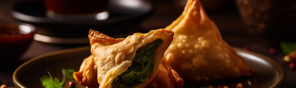 Gefrituurd deeg rijkelijk gevuld met aardappelen, groene erwten en komijn.